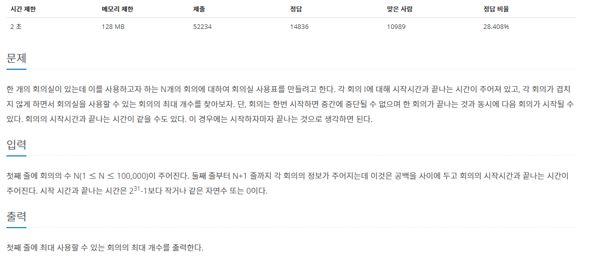 - 최대한 많은 회의를 배정하기 위해서는 빨리 끝나는 회의를 우선배치해야 됩니다.