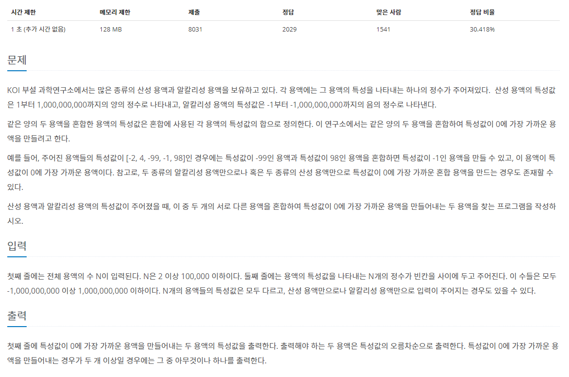 백준 2470번: 두 용액 본문