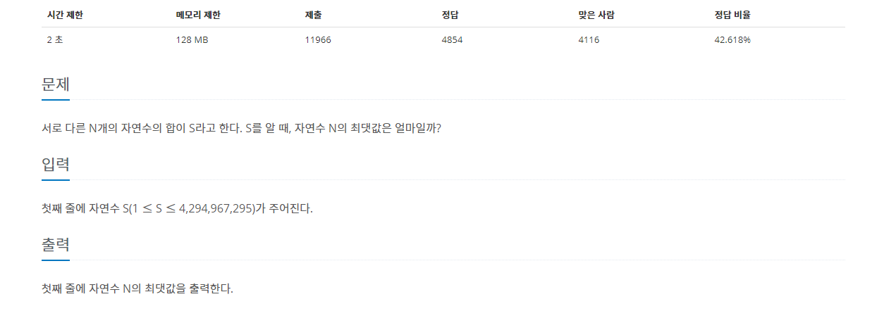 서로 다른 N개의 자연수의 합이 S라고 한다. S를 알 때, 자연수 N의 최댓값은 얼마일까?