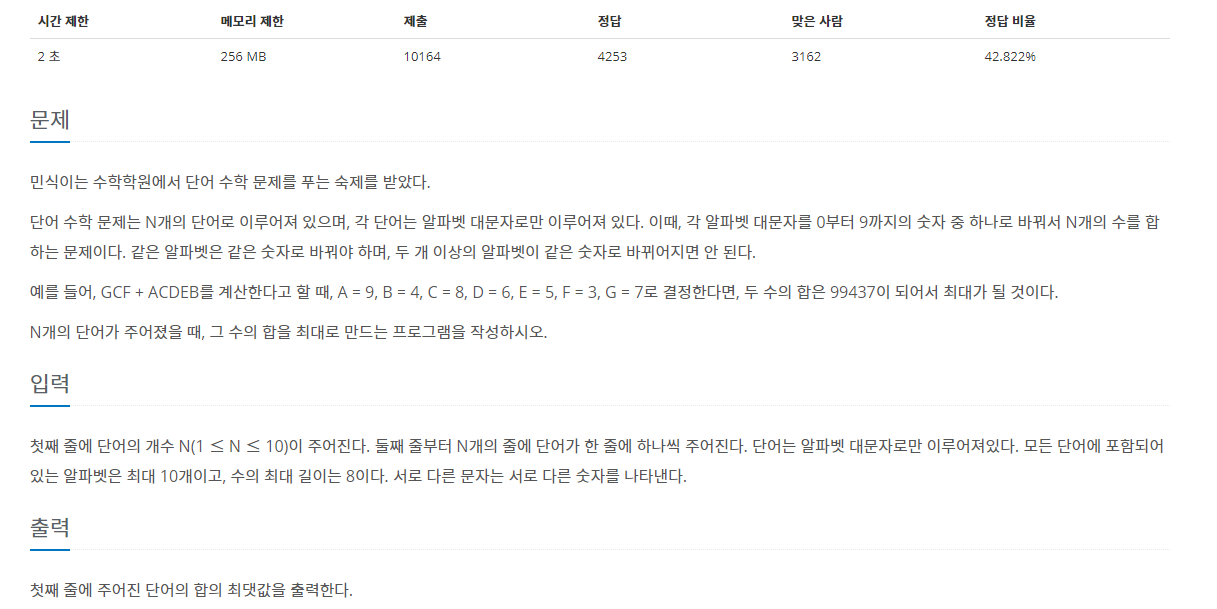 단어 수학 문제는 N개의 단어로 이루어져 있으며, 각 단어는 알파벳 대문자로만 이루어져 있다. 이때, 각 알파벳 대문자를 0부터 9까지의 숫자 중 하나로 바꿔서 N개의 수를 합하는 문제이다. 같은 알파벳은 같은 숫자로 바꿔야 하며, 두 개 이상의 알파벳이 같은 숫자로 바뀌어지면 안 된다.